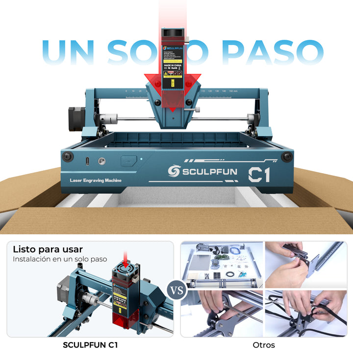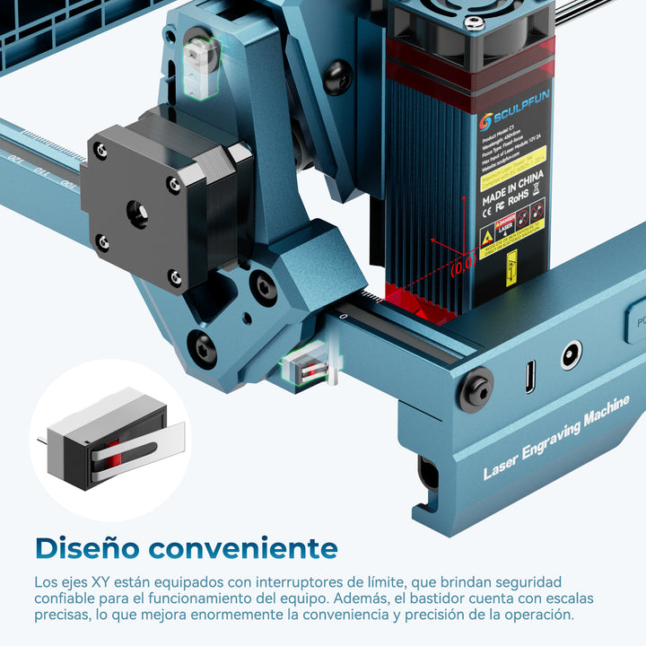 La Sculpfun C1 es la opción ideal para principiantes. Viene preensamblada con funciones fáciles de usar, lista para usar desde el primer momento. Esto elimina las complicaciones del ensamblaje y garantiza una excelente experiencia de usuario. Equipada con interruptores de límite en los ejes X e Y para garantizar la seguridad y facilitar el reinicio.