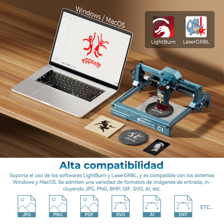 Se puede utilizar con el software profesional de grabado láser LightBurn y LaserGRBL, y es compatible con sistemas Windows y macOS, lo que facilita el trabajo. Además, cuenta con una potente función de entrada de imágenes compatible con múltiples formatos comunes como JPG, PNG, BMP, GIF, SVG, AI, etc., lo que proporciona una amplia y diversa selección de materiales para sus ideas creativas y satisface las necesidades de uso en diferentes escenarios.