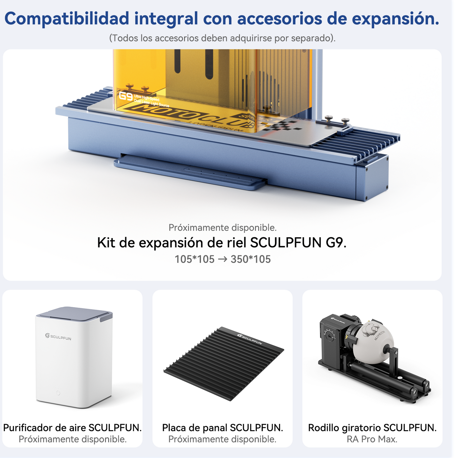 La SCULPFUN G9 es compatible con el purificador de aire SP1, el kit de extensión deslizante para G9 y los accesorios de rodillo giratorio RA Pro Max, para que descubras más posibilidades.