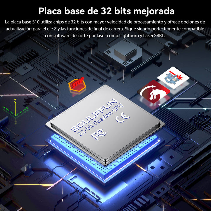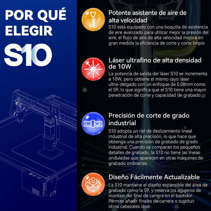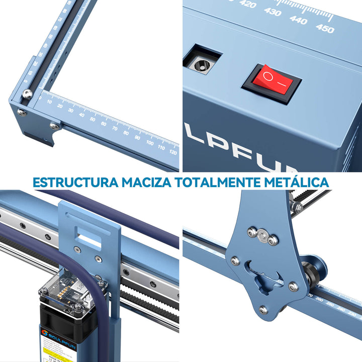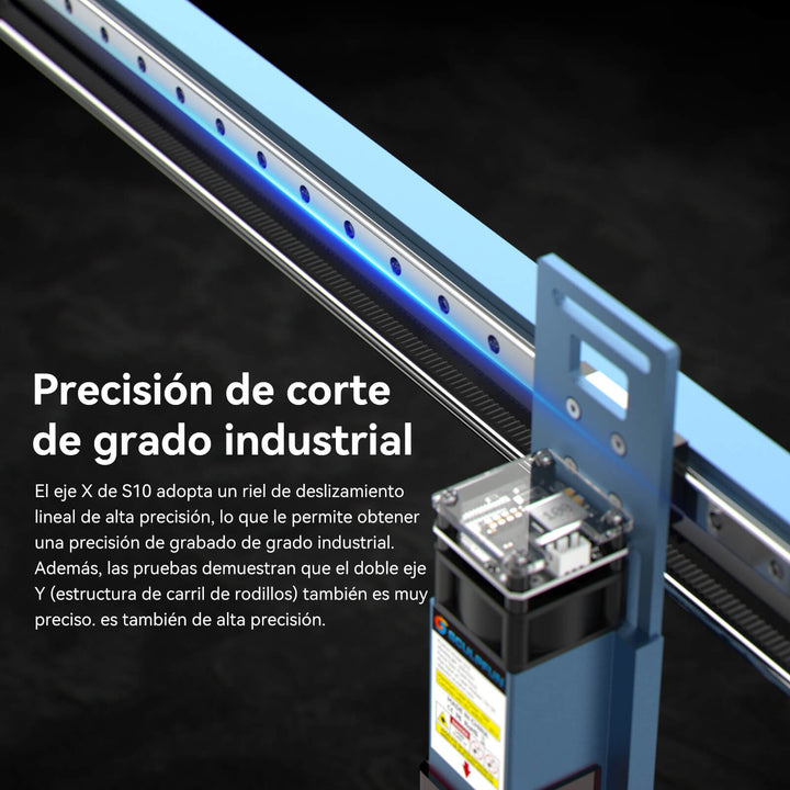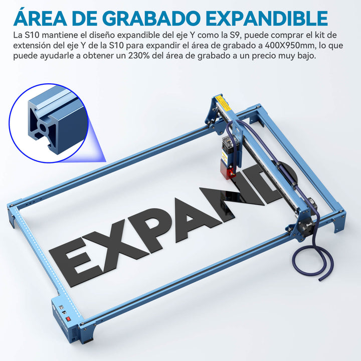 Área de grabado ampliable: El S10 mantiene el diseño ampliable del eje Y, al igual que el S9, el área de grabado original es de aproximadamente 410x400 mm, pero puedes adquirir el kit de extensión del eje Y del S10 para ampliar el área de grabado a 410x940 mm, lo que te permite obtener un 230% más de área de grabado a un precio muy bajo. Esto te ayudará a lidiar mejor con trabajos de grabado o corte en áreas grandes.