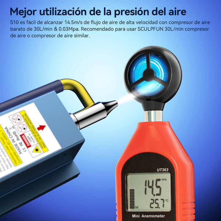 Potente sistema de asistencia por aire de alta velocidad: El modelo S10 está equipado con una boquilla de asistida por aire a alta velocidad. La diferencia de esta boquilla radica en que tiene un diseño avanzado de mecánica de fluidos para aprovechar mejor la presión del aire. Al utilizar el mismo compresor de aire, el flujo de pulverización del S10 es más rápido. Por ejemplo, al usar un compresor de aire de 30L/min y 0.03Mpa, la boquilla del S10 pulverizará un flujo de aire de alta velocidad de hasta 14.5m/s. Esto mejorará significativamente la penetración y eficiencia de corte.